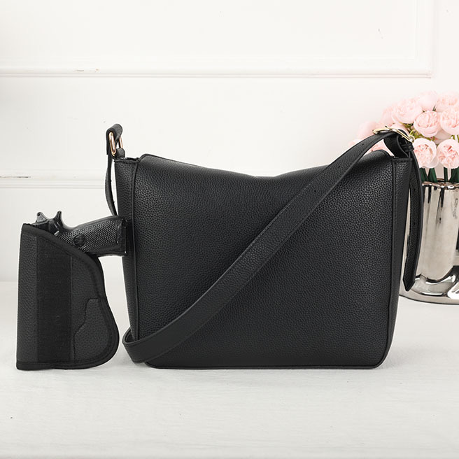 Purse – Black The CCW holster is located in the main compartment of the purse. Universal holster included. Material : PU Dimensions :10.5“ W X 9“ H X 4“ D Weight : 1 lb
