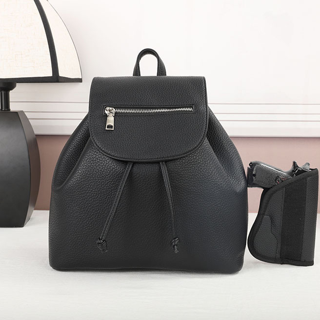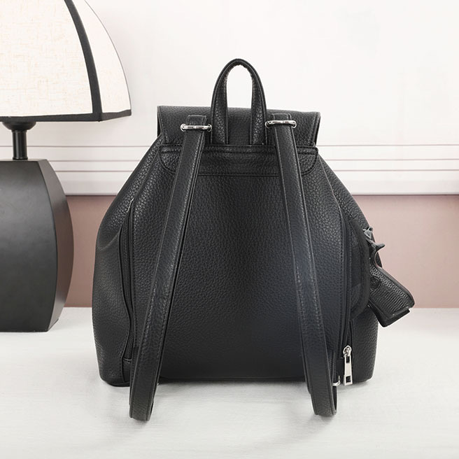 Backpack – Black The CCW compartment is located on the back side of the backpack with two zippers on each side. Universal holster included. Material : PU Dimensions :11.5" W X 11.5" H X 5" D Weight : 1 lb