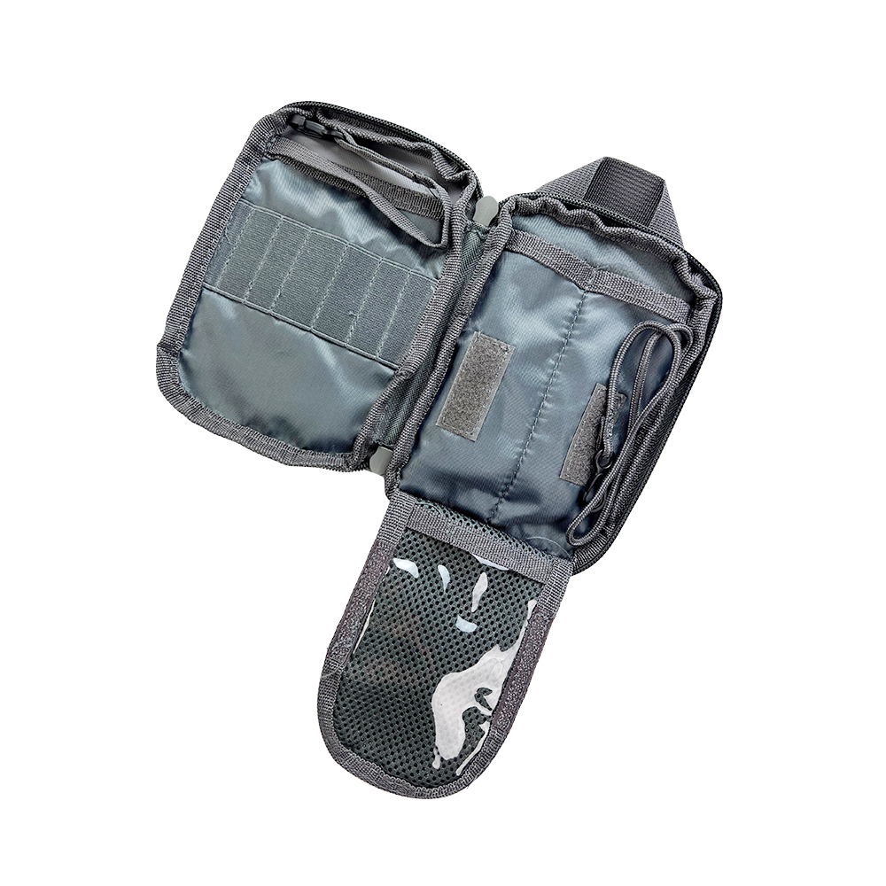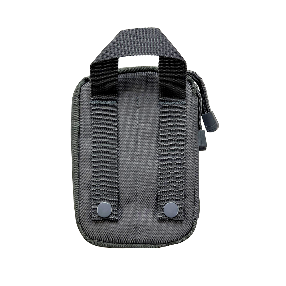 • Two zippers with cord zipper pulls and a small carry handle strap on the pack of the pouch.