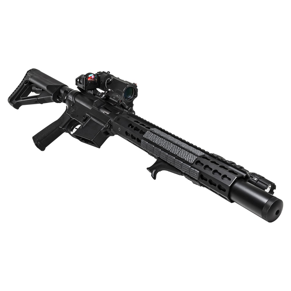 • Mounts onto handguard via one KeyMod® feet. Hand stop covers 3 KeyMod® slots.