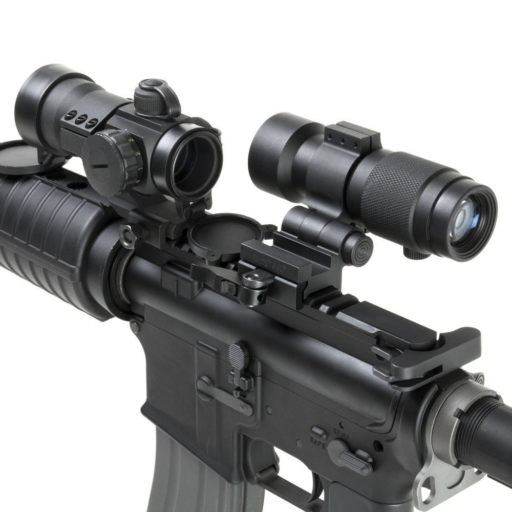 • This Magnifier can be mounted behind a 1X Reflex optic. You can quickly switch between 1X Magnified Optic for close ranges to 3X Magnified optic for intermediate to longer ranges, with a push of a button and a simple flip to side movement of the magnifier.