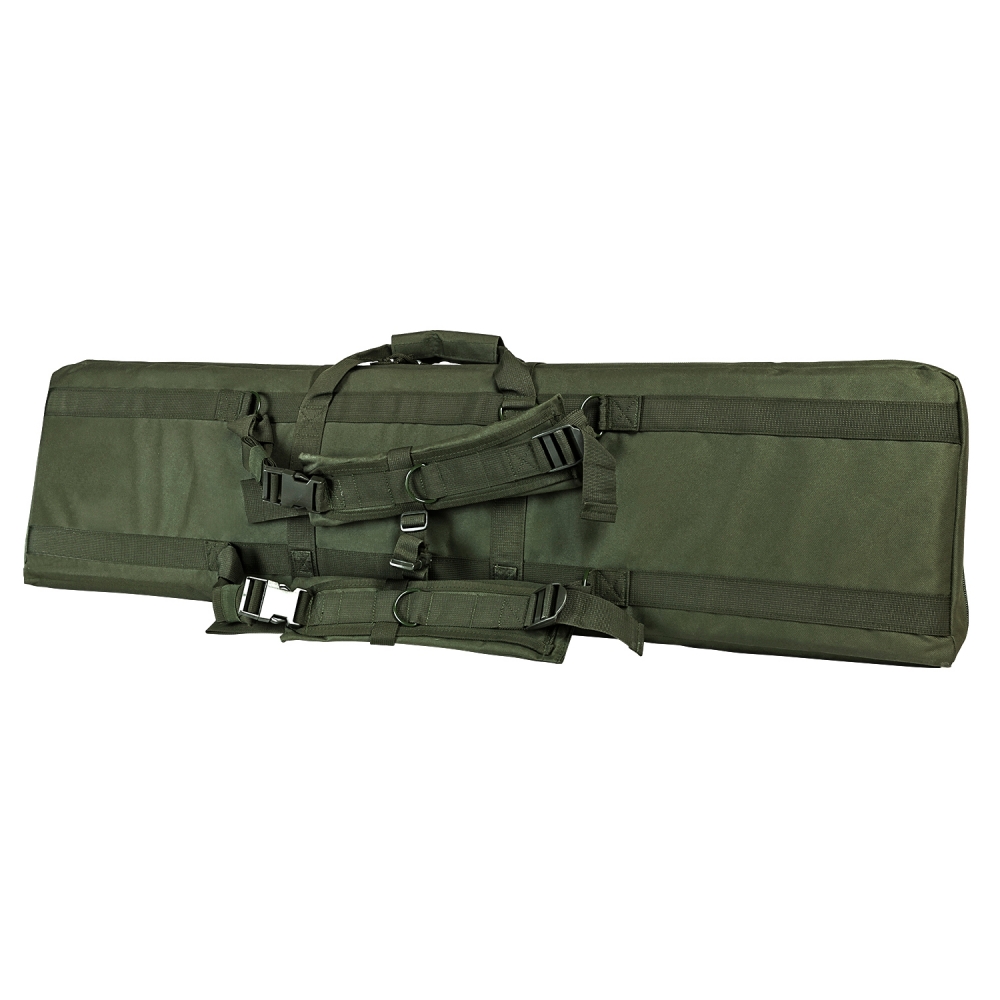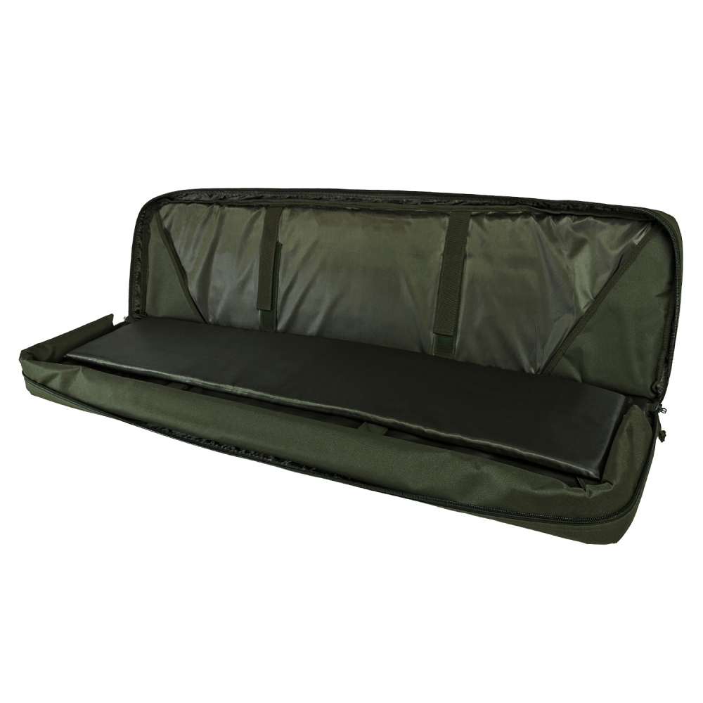 • 46” Double Carbine Case is constructed of heavy duty PVC material and the main compartment is fully padded on all side with thick ½” closed cell foam padding. The main compartment has Heavy Duty zippers with metal zipper pulls that can be locked with a small pad lock (lock not included).