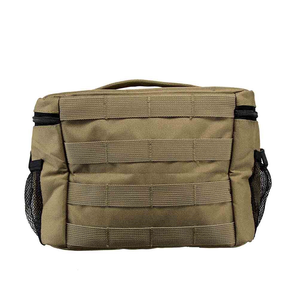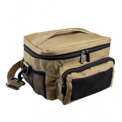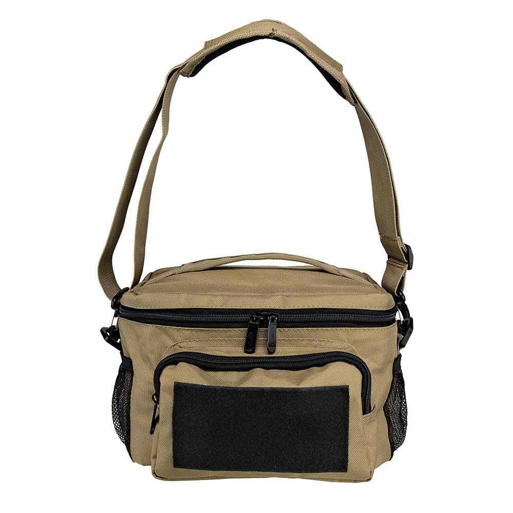 • Insulated cooler lunch bag with adjustable shoulder strap and PALs/MOLLE compatible webbing sewn on the back panel of the cooler.