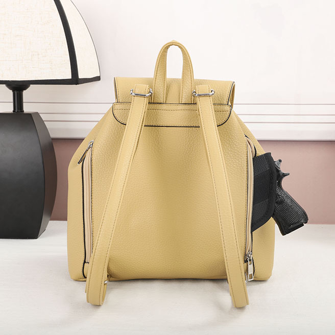 Backpack – Yellow The CCW compartment is located on the back side of the backpack with two zippers on each side. Universal holster included. Material : PU Dimensions :11.5" W X 11.5" H X 5" D Weight : 1 lb