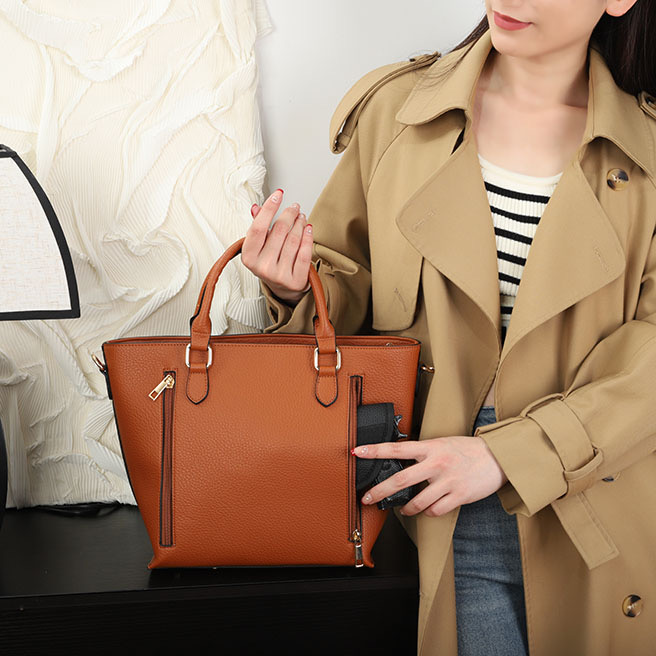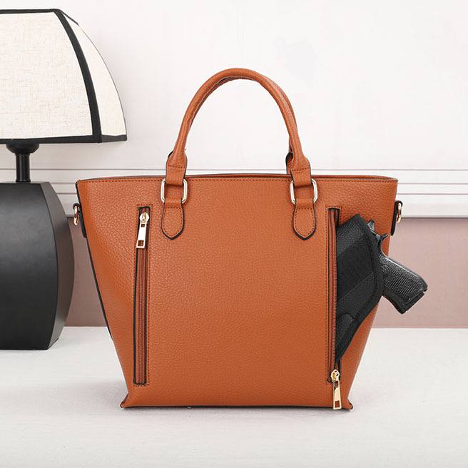 Purse – Brown The CCW compartment is located on the back side of the purse with two zippers on each side. Universal holster included. Material : PU Dimensions : 14“ W X 10.5“ H X 4.5“ D Weight : 1.3 lb