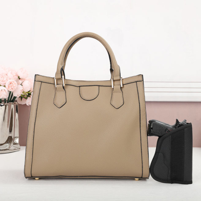 Purse – Tan The CCW compartment is located on the back side of the purse with two zippers on each side. Universal holster included. Material : PU Dimensions :12.5“ X 10“ H X 5“ D Weight : 1.5 lb