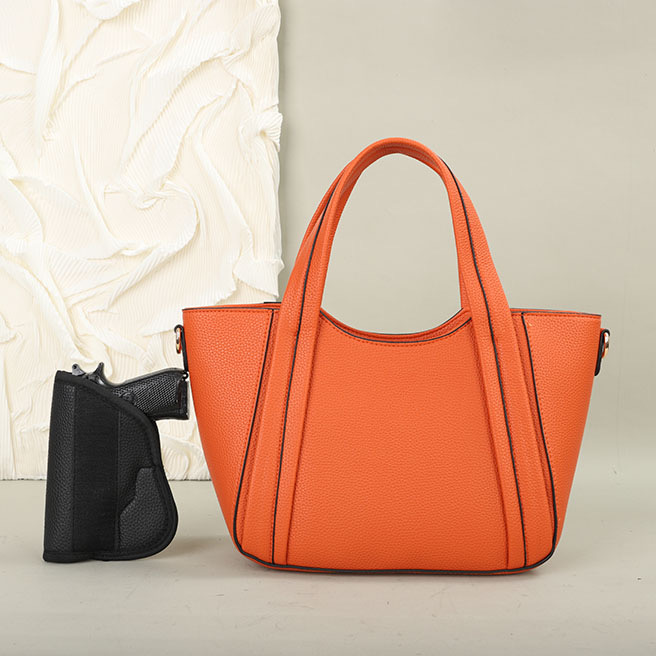 Purse – Orange The CCW holster is located in the main compartment of the purse. Universal holster included. Material : PU Dimensions :13.5“ W X 8.5“ H X 4.5“ D Weight : 1.3 lb