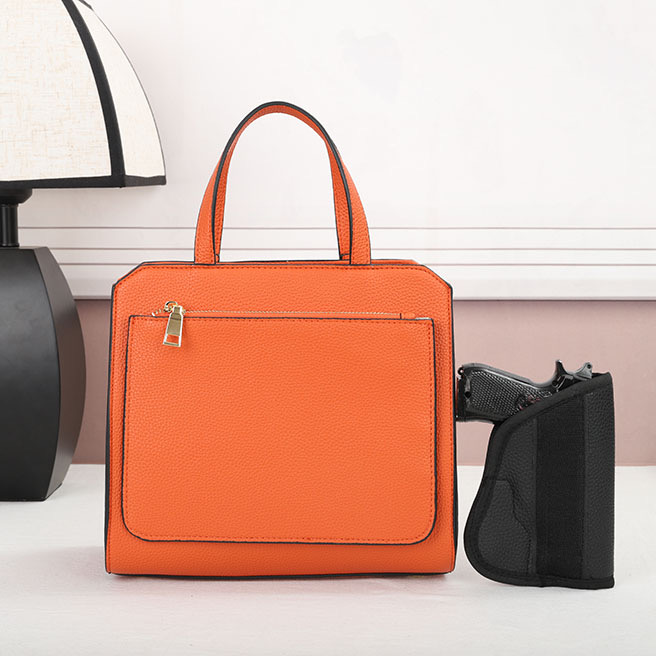 Purse – Orange The CCW holster is located in the main compartment of the purse. Universal holster included. Material : PU Dimensions :9.7“ W X 9“ H X 5.5“ D Weight : 1.2 lb