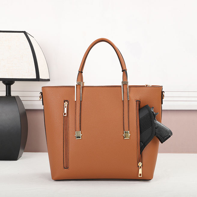 Purse – Brown The CCW compartment is located on the back side of the purse with two zippers on each side. Universal holster included. Material : PU Dimensions :14“ W X 10.5“ H X 4“ D Weight : 1.4 lb