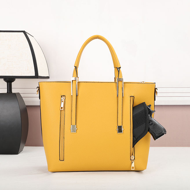 Purse – Yellow The CCW compartment is located on the back side of the purse with two zippers on each side. Universal holster included. Material : PU Dimensions :14“ W X 10.5“ H X 4“ D Weight : 1.4 lb