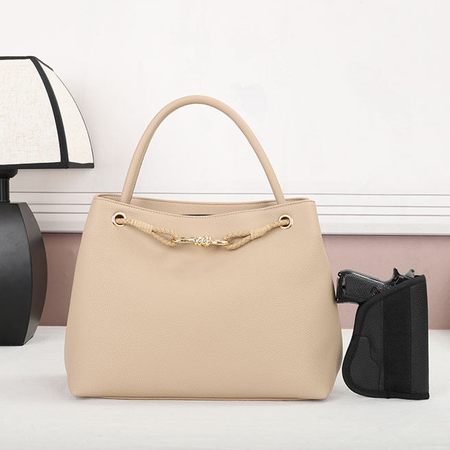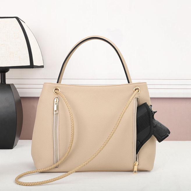 Purse –Tan The CCW compartment is located on the back side of the purse with two zippers on each side. Universal holster included. Material : PU Dimensions : 12.5" W X 10" H X 5" D Weight : 1.3 lb