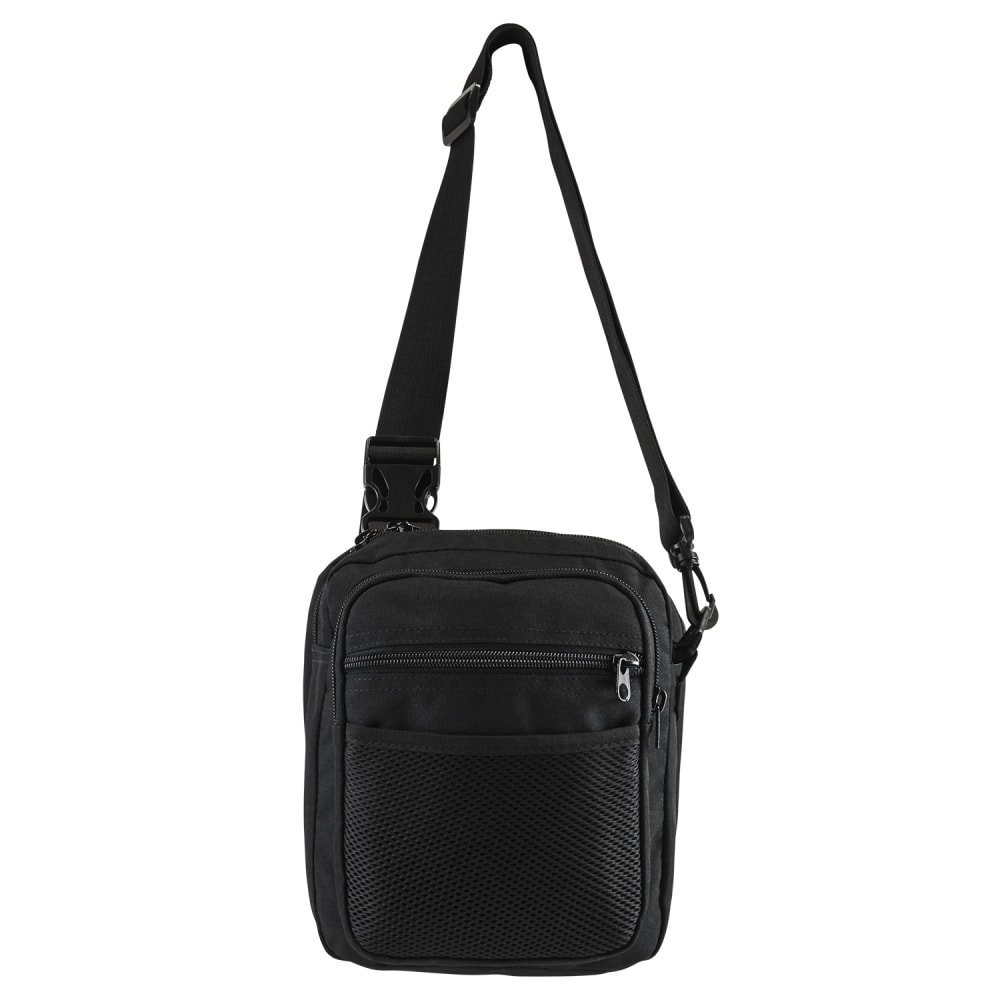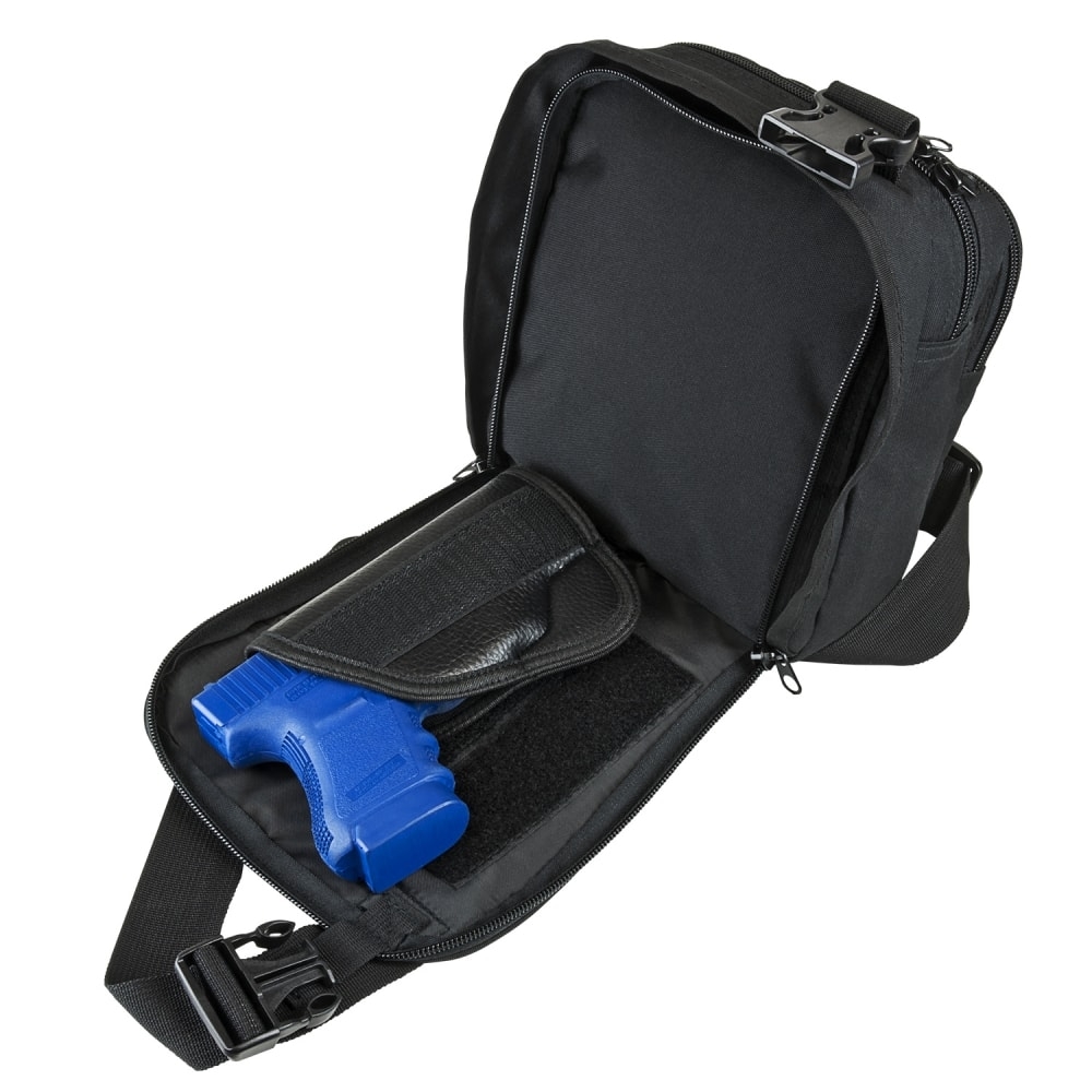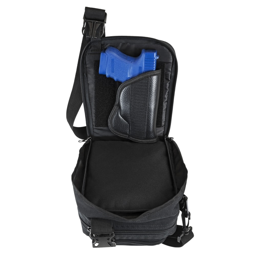 • Hidden dual zippered CCW compartment that is secured with a quick connect plastic buckle. Unlatched the buckle and pull the buckle and shoulder strap apart to automatically to reveal and expose the hidden CCW compartment and holster.