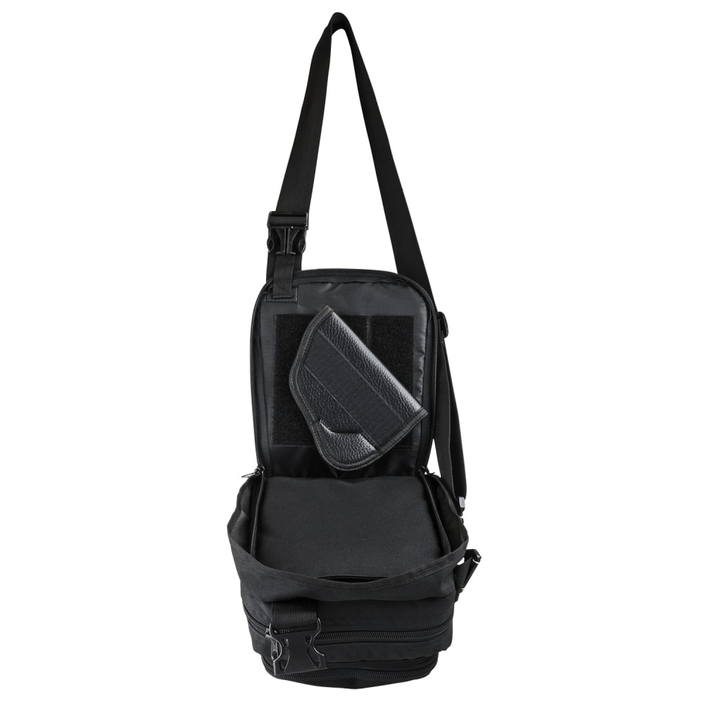 • CCW compartment includes a universal ambidextrous holster with hook fastener strip sewn to both sides, which allows the wearer to attach the holster in any position inside the CCW compartment that has is lined with the loop fastener strips 5.5"H X 5.75"W.