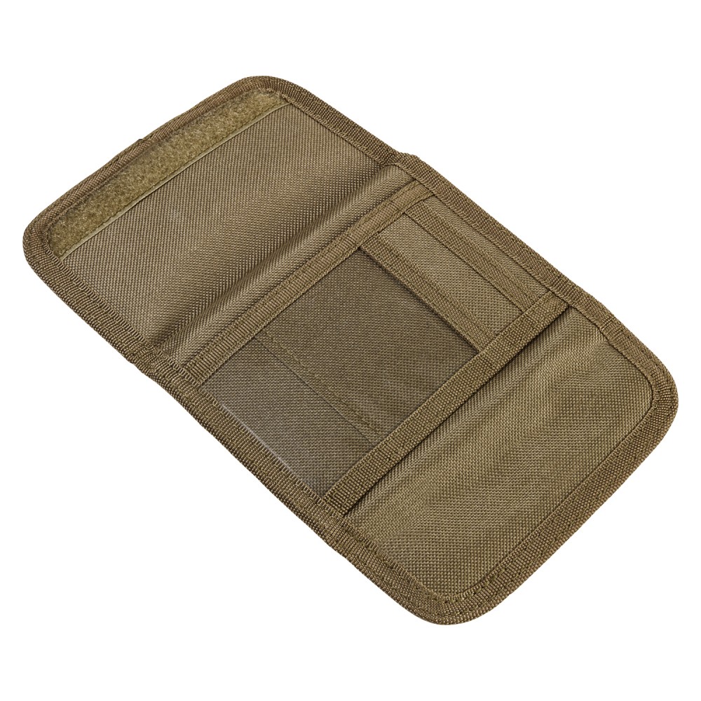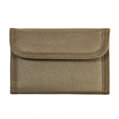 • Tan bifold wallet with several ID & credit/membership card pockets inside and out. The wallet has a hook and loop fastener enclosure flap.