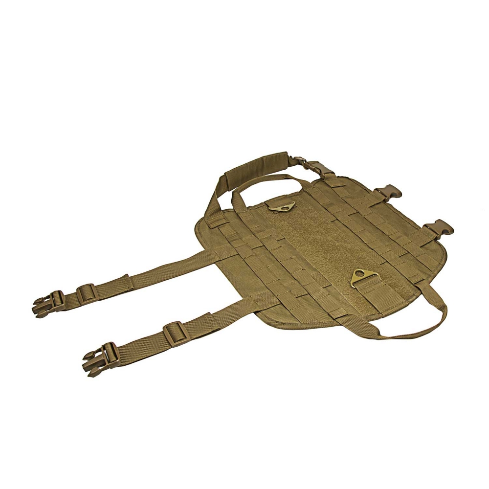 • Two rows of PALS webbing on the side panels for attaching MOLLE pouches to the vest. Two metal ring loops located on the back. One of the ring loops located over the shoulders and one by the hip for attaching leads/leashes.